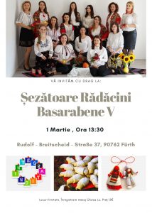 ”Odată cu primăvară vine și o nouă Șezătoare ”Rădăcini Basarabene” (ediția V-a), care va avea loc pe 1 martie. Vom confecționa Mărțișoare, ghidate de Golovei Nadejda. Vom afla rețeta secretă a cornulețelor cu vișină de la Marcela Rusu. De asemenea vom afla cum să mergem cu pași siguri spre integrare în Germania – cu informație utilă de la Diana Moldau. Iar drept bonus vom avea o surpriză culinară cu gust german – Nürnberger Bratwurst și un pahar de vin (sau apă)”. Informațiile au fost oferite Portalului Nr.1 al Diasporei ER NEWS de către una dintre organizatoarele evenimentului Olga Soltinschi, conaționala noastră stabilită de aproape 2 ani în Germania.