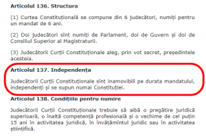 Doar că, în calitate de deputat, Vasile Bolea, trebuie să știe că CSM nu are nicio competență în ceea ce privește judecătorii Curții Constituționale. Astfel, potrivit Constituției, art.137, Judecătorii Curţii Constituţionale sînt inamovibili pe durata mandatului, independenţi şi se supun numai Constituţiei.