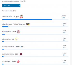 CEC publică primele rezultate preliminare ale alegerilor locale generale desfășurate astăzi. A început prelucrarea proceselor verbale și în municipiul Orhei. Primele rezultate arată că Pavel Verejanu de la Partidul Șor se plasează pe primul loc. Acesta acumulează în momentul de față 75,24% din voturi, transmite ER NEWS.